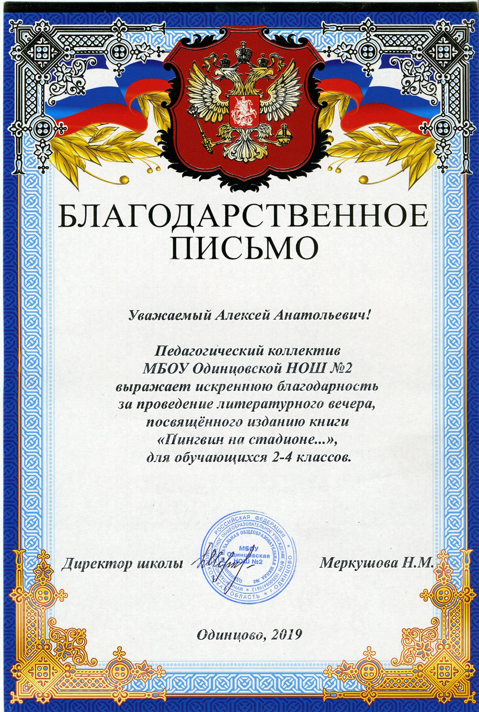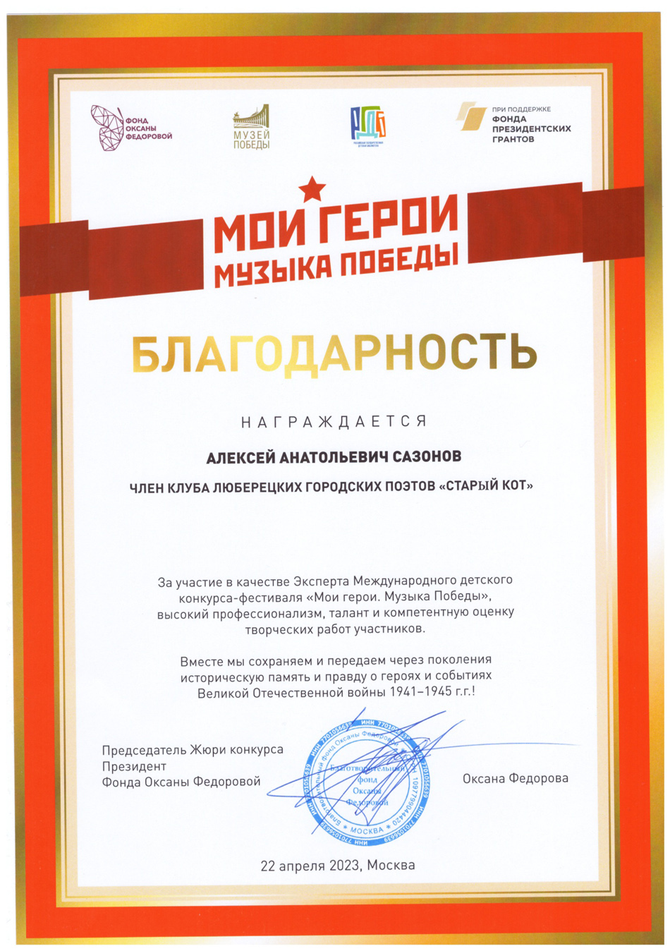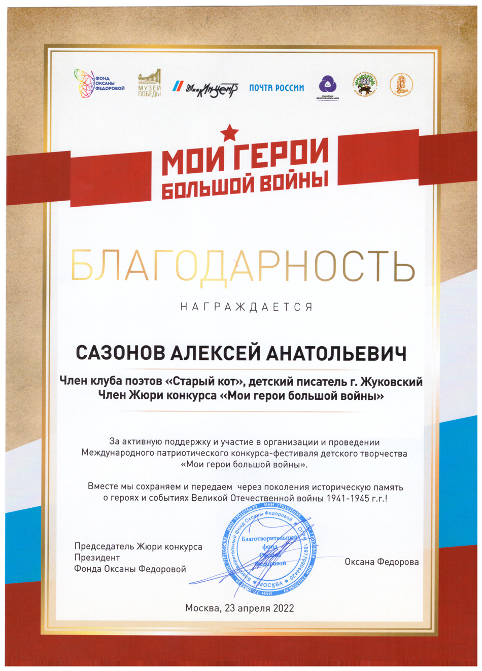 Благодарственные письма и награды Сазонова Алексея Анатольевича