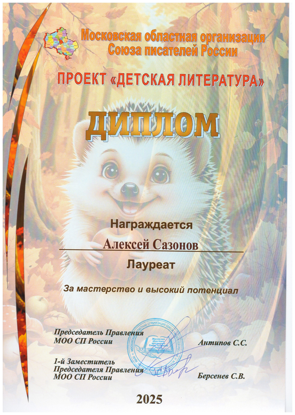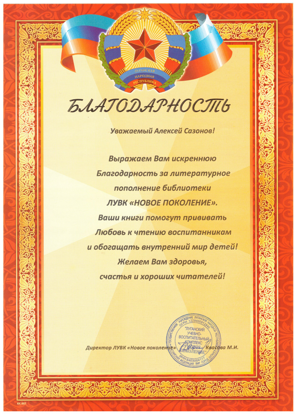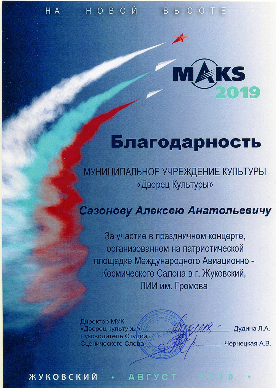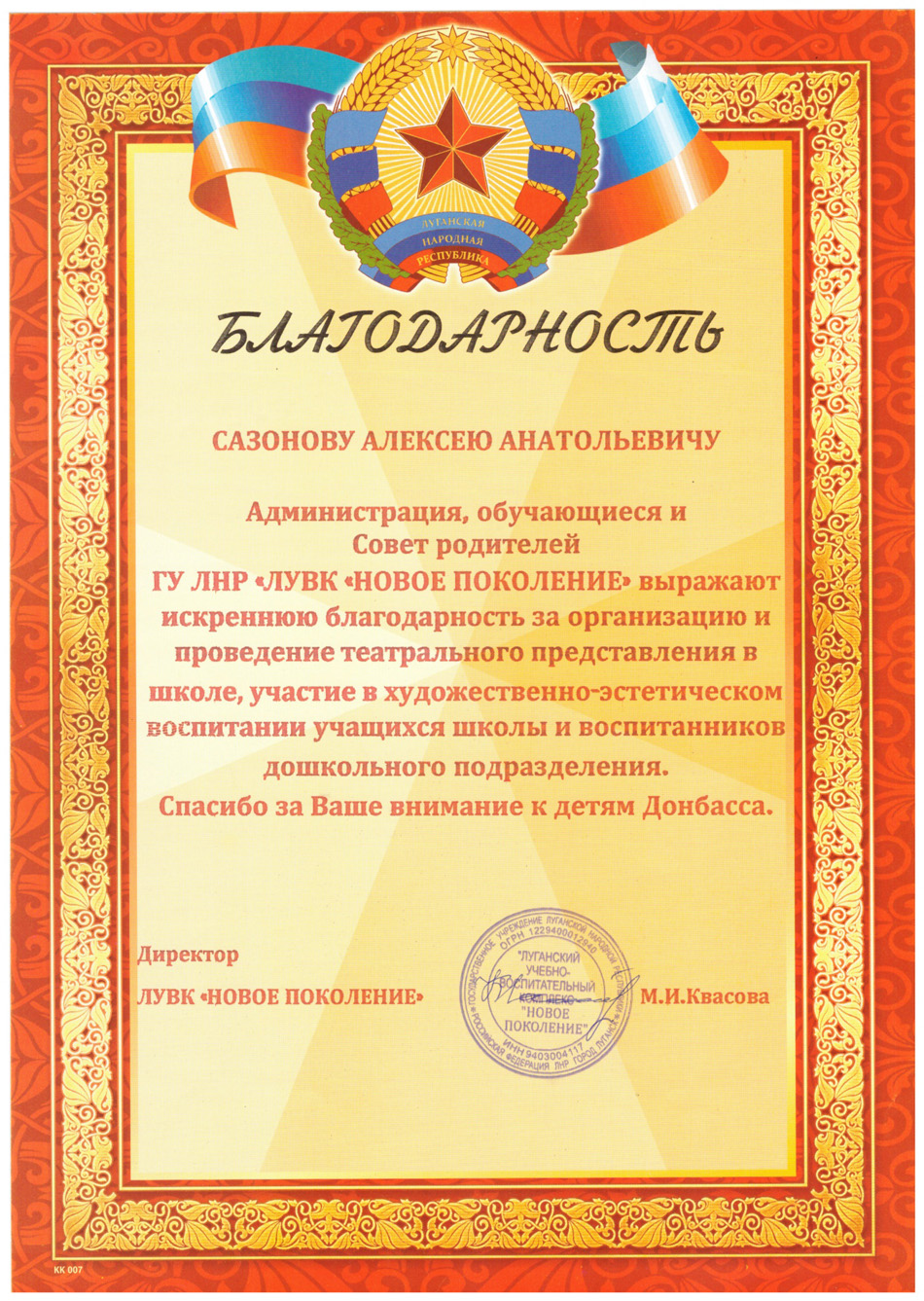 Благодарственные письма и награды Сазонова Алексея Анатольевича