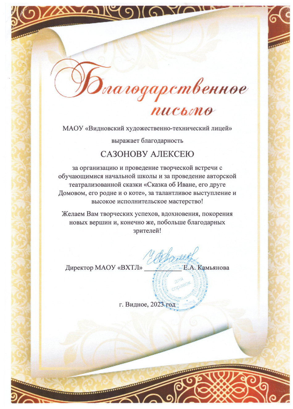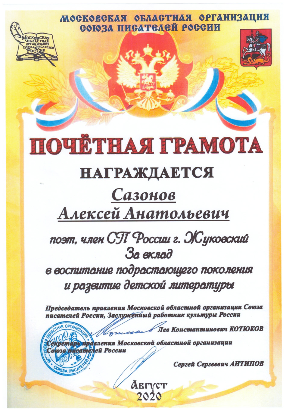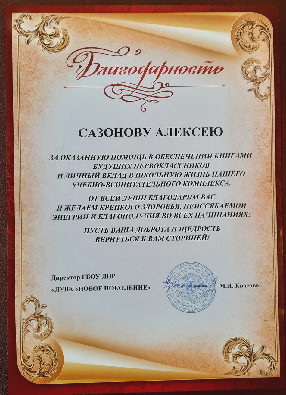 Благодарственные письма и награды Сазонова Алексея Анатольевича